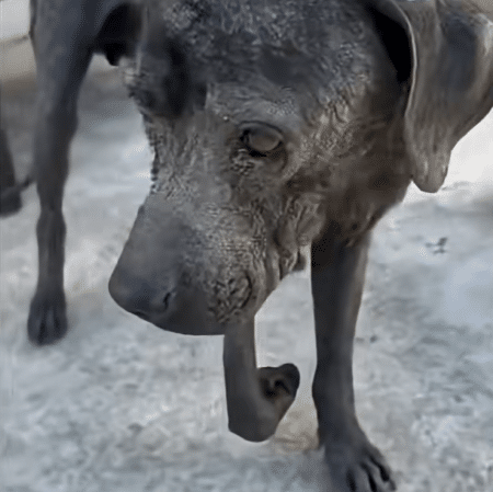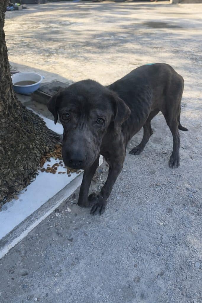 His fur, once dark and thick, now clung to a frame where every bone seemed visible.