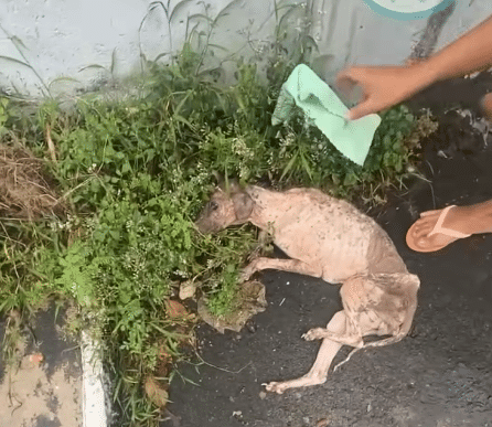 Despite the pain he was clearly experiencing, the dog did not resist when he was gently lifted from the ground. His body was weak, but there was still a quiet determination in his eyes.