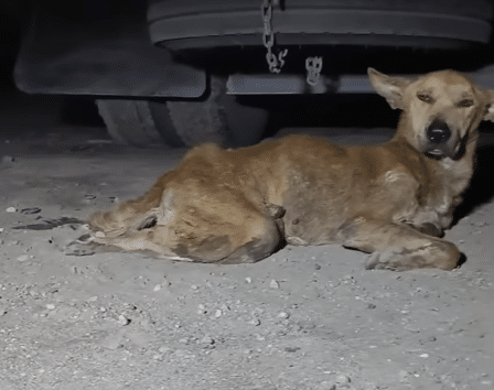 A thin, exhausted dog lay curled tightly in the shadows under the vehicle. His fur was dirty and damp, suggesting he had been surviving outside for quite some time.