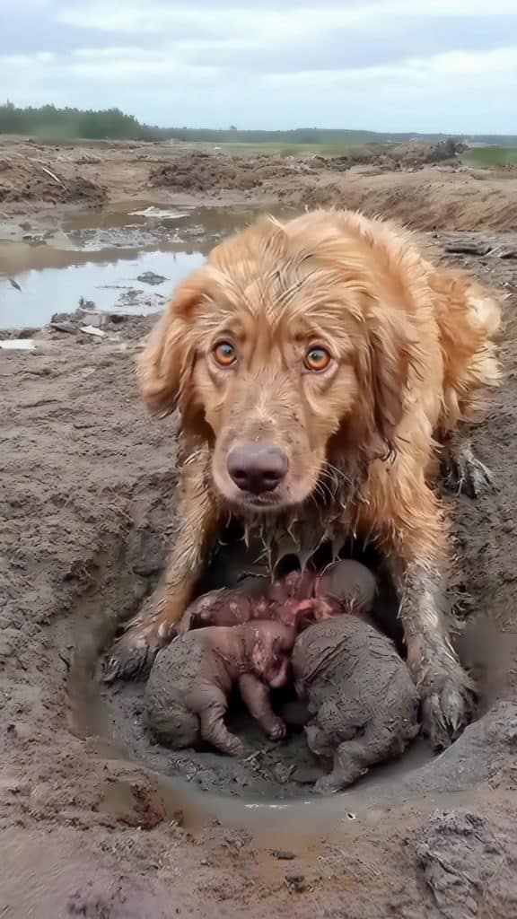 In a shallow pit filled with cold mud, she gave birth to her puppies. The muddy ground became the only place she had to care for them. The tiny newborns were blind and fragile, relying completely on their mother for warmth and protection.