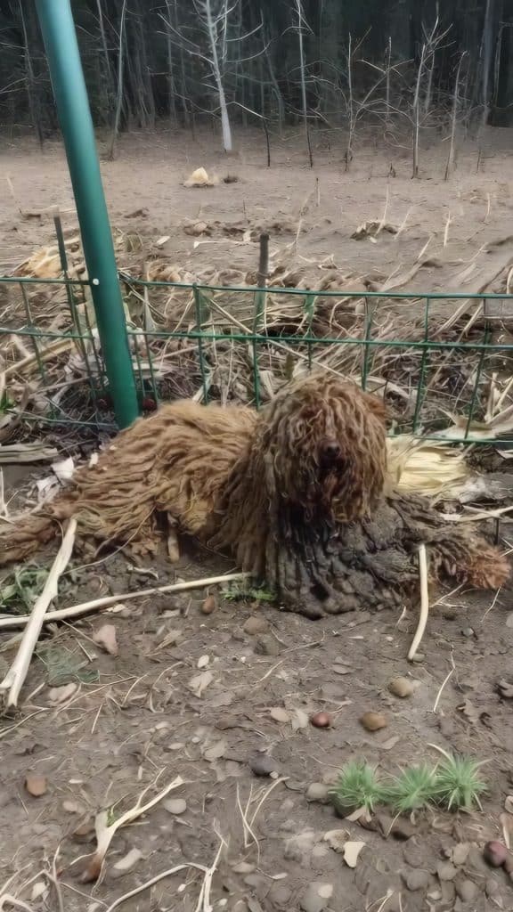 Her body was buried beneath thick layers of tangled, filthy fur that clung together in heavy mats. The fur had twisted so tightly that it looked almost like worn pieces of cloth wrapped around a fragile frame. Beneath those layers, a living creature struggled to remain standing.