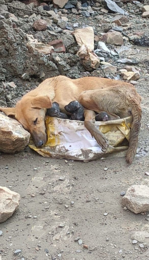 They found the mother dog weak and overwhelmed, her body worn out from both labor and the stress of protecting her newborn puppies in such a dangerous place.