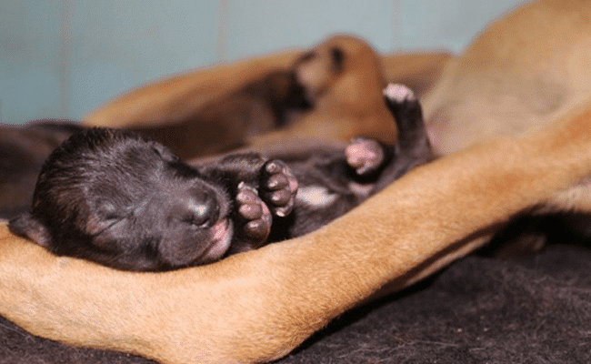 With the little energy she had left, she pulled the newborn puppies close to her body, tucking them carefully between her legs.