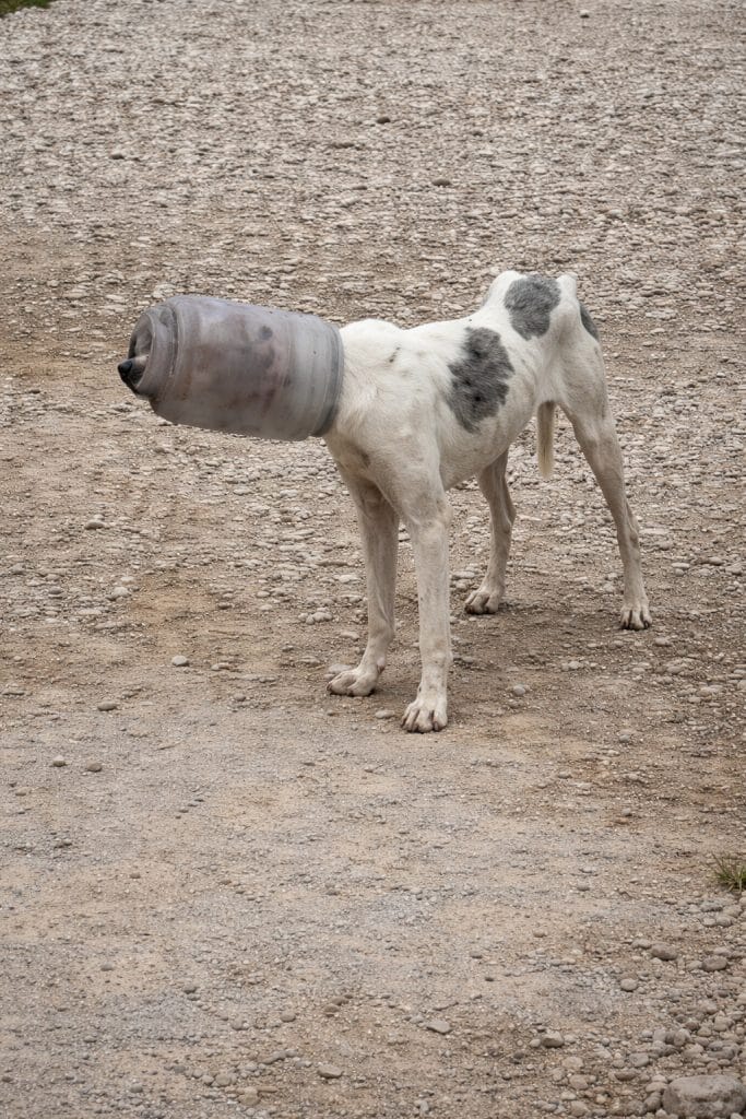 In Cleveland, Texas, people began sharing photos online of a stray dog wandering the streets with his head completely stuck inside a large plastic container. No one knew exactly how long he had been like that.