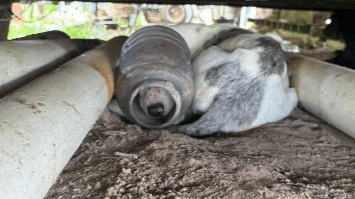 Because he could not see clearly through the plastic, the dog panicked whenever someone tried to approach. He ran from place to place, eventually hiding beneath a building where rescuers could not easily reach him.