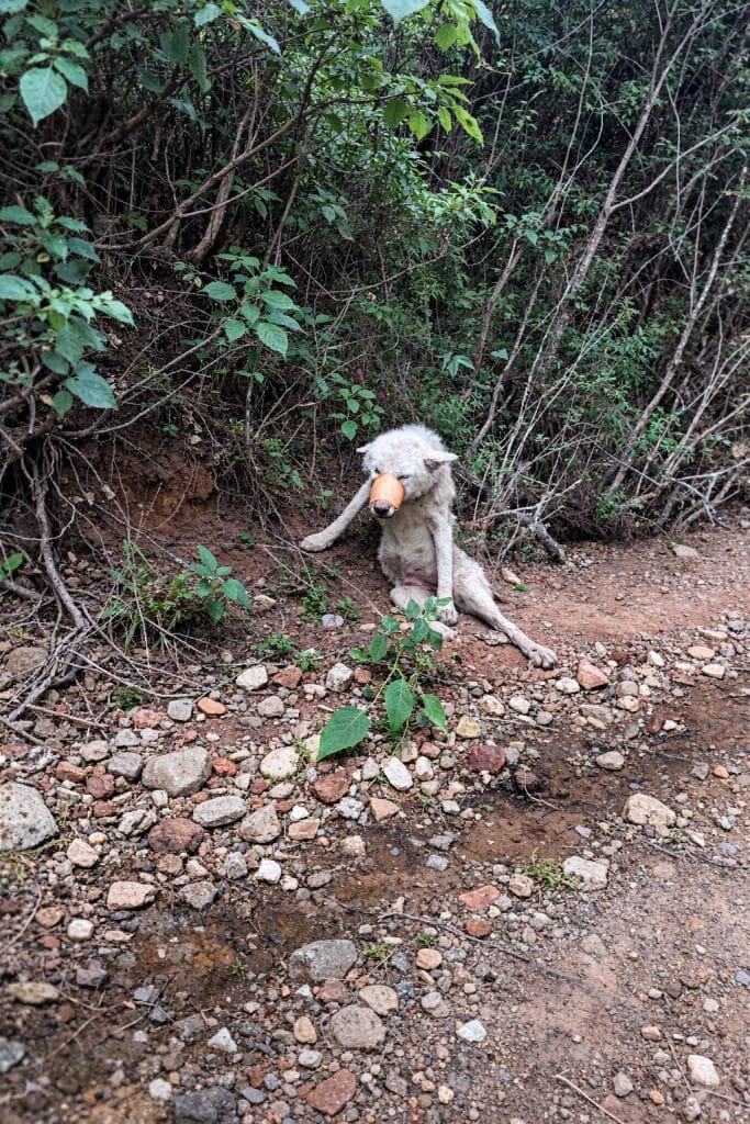 Hidden among the trees lay a small dog in a devastating condition. Her mouth had been tightly wrapped with tape, preventing her from barking or eating. Weak and exhausted, she had been left there alone.