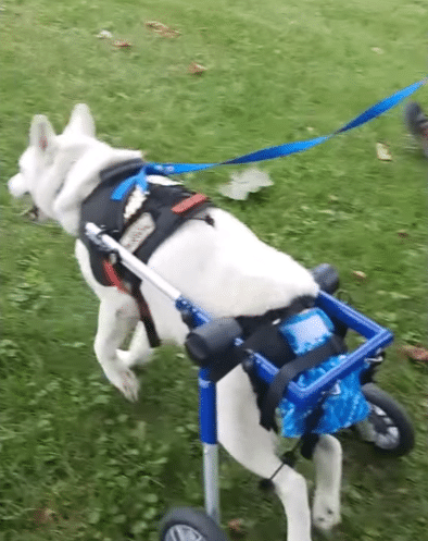 Angel began a challenging rehabilitation process. Because her back legs were still weak, she used a special wheelchair designed for dogs with mobility problems.