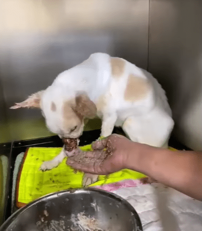 Part of the delicate skin around his mouth had torn, leaving painful wounds that needed immediate medical attention. The puppy was dangerously thin and clearly exhausted from hunger.