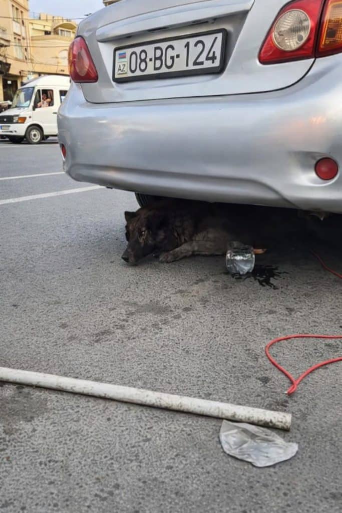 Looking closer, he discovers a dog hiding deep underneath the car’s frame.