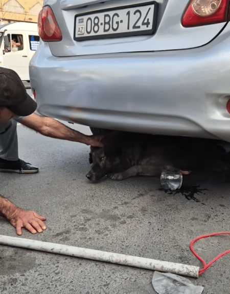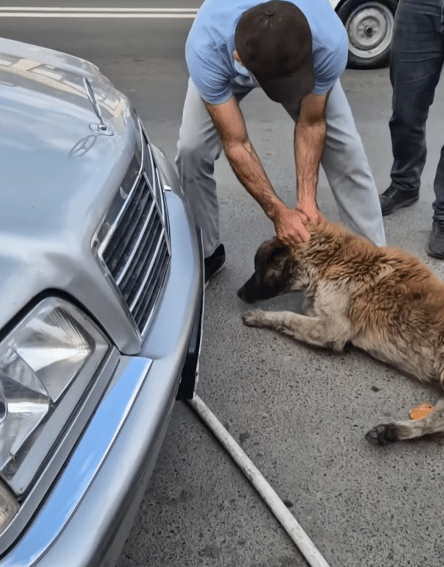 Instead of rushing, the man slowly reaches under the car and gently strokes the dog’s head.