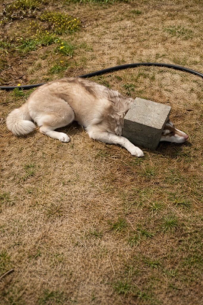 Skya had been exploring the yard like many dogs do, sniffing around and investigating everything she could find. At some point during her adventure, she noticed a hollow opening in a cinder block lying on the ground.