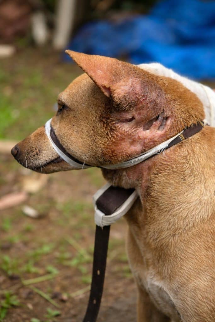 Closer inspection revealed deep wounds around his neck and ears. The injuries had become badly infected, and parasites had begun to develop in the open flesh.