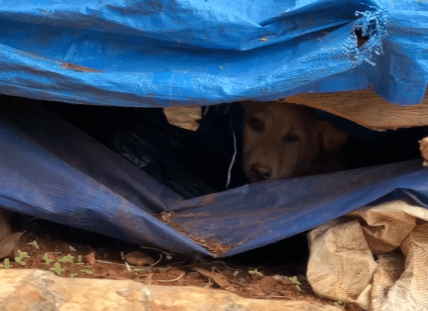 When they arrived at the location, they found the dog hiding beneath an old tarp, trying to stay out of sight. His body looked exhausted, and his movements were slow and cautious.
