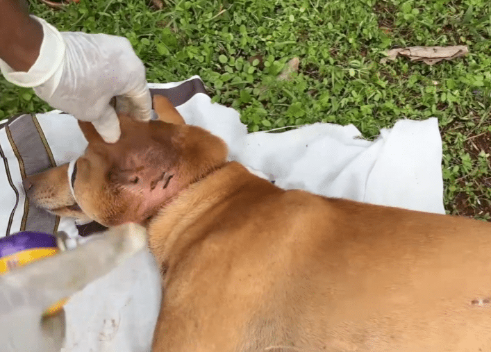 To prevent sudden reactions during treatment, they gently secured the dog’s mouth while wearing protective gloves. Their goal was not only to help him but also to ensure the process remained safe for everyone involved.