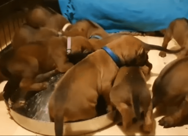 Around the fourth week, fifteen energetic pups began running across the house, exploring every corner. Because they had grown so quickly, Mira often had to stand while feeding them, surrounded by a lively crowd of hungry puppies.