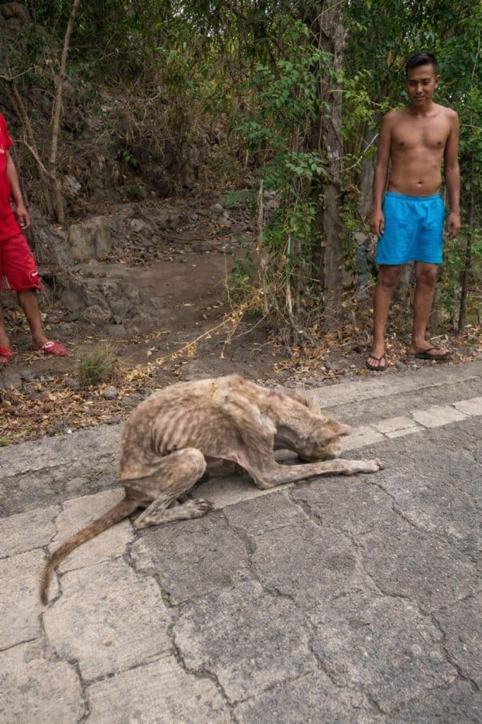 A dog lay on the ground, too weak to stand.