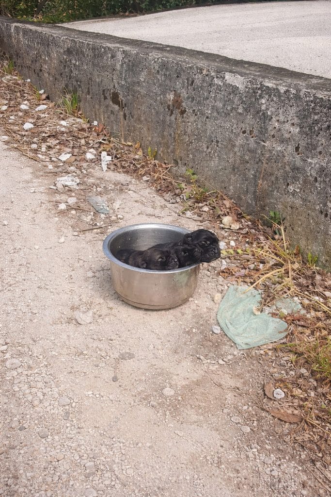 Inside a small metal pot, three tiny puppies had been abandoned.