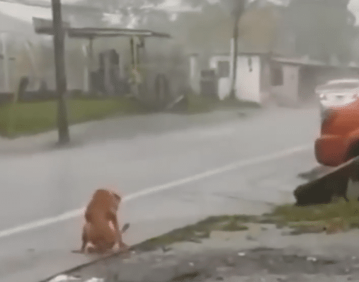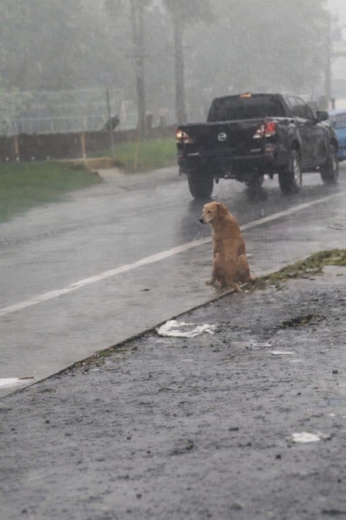 On a cold, rainy day, a stray dog later named Derby sat trembling beside a busy road. Rain poured down steadily, soaking his thin fur as traffic rushed past without slowing.