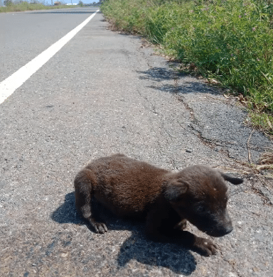 On the side of a quiet street, a tiny puppy lay curled into herself, barely moving. Her fragile body was thin from hunger, her ribs faintly visible beneath patchy fur. Every movement seemed to take effort.