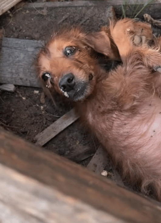 In a quiet corner filled with broken wood, scattered trash, and forgotten debris, a small brown dog lay almost motionless. At first glance, it was easy to miss him. His tiny body blended into the dull colors of the rubble around him, as if the world had slowly forgotten he was there.