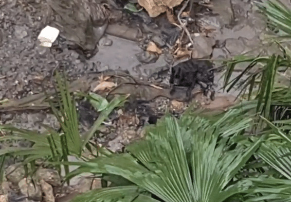 Far below, inside a deep drainage ditch filled with muddy water, a black dog lay motionless. From above, it was difficult to see clearly, but one thing was obvious — the dog was in serious trouble.