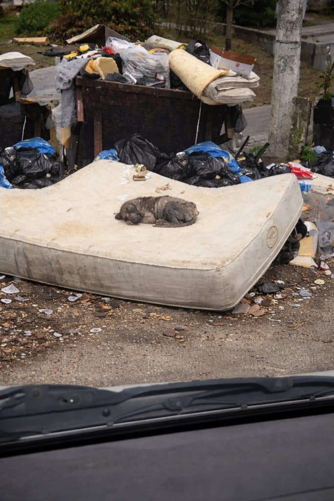 Lying on an old mattress surrounded by scattered trash was a dog whose body seemed too weak to move. His skin was bare, wrinkled, and covered with painful sores. Most of his fur had already fallen out, leaving fragile skin exposed to the cold air.