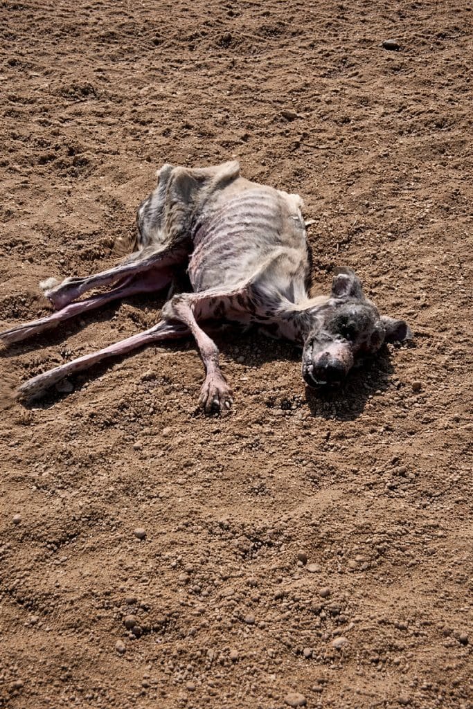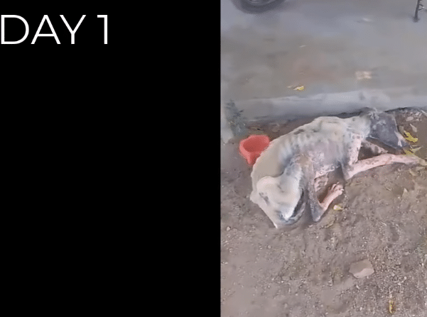When rescuers first saw her, the little dog lying on the dusty ground barely looked alive. Her body was painfully thin, almost nothing more than skin stretched over fragile bones. The harsh sunlight beat down on her as she lay there, too weak to move.