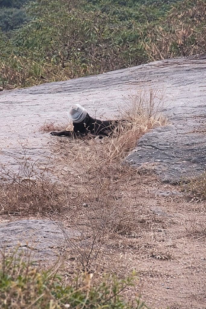 Situations like this highlight the unexpected dangers that discarded plastic can create for wildlife and stray animals. Objects left behind in nature can easily become traps for curious animals searching for food.