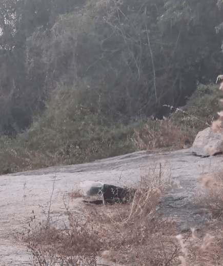 When they arrived at the hillside, they saw the dog moving nervously across the rocks. Because the plastic container covered its face, the dog was disoriented and frightened.