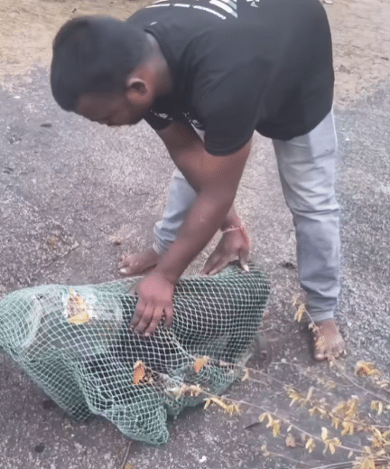 To prevent the dog from injuring itself further, the rescue team used a large safety net. After a brief chase across the hillside, they were able to gently secure the animal inside the net.
