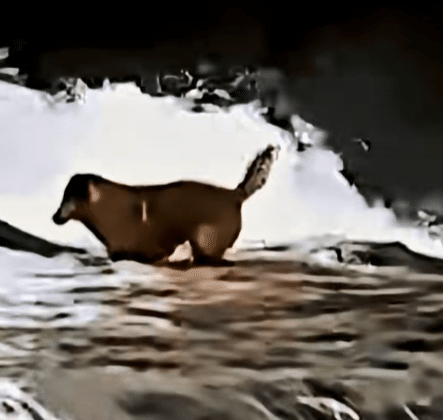 In order to survive, the dog manages to hold onto what appears to be a pipe or a solid structure partially submerged in the rushing current.