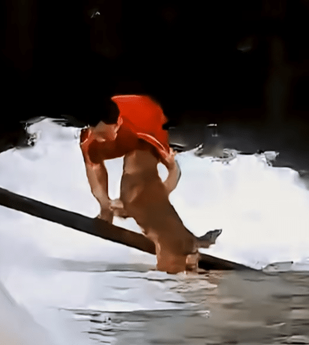 Then, in a moment that brings visible relief to everyone watching, the dog is finally lifted out of the dangerous water.
