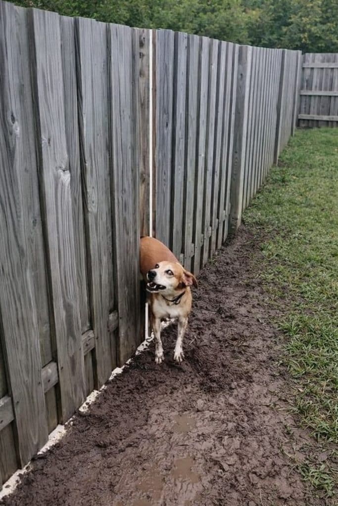 The narrow gap in the fence held the dog firmly in place. No matter how much the little dog wriggled or pulled, it could not free itself. Each attempt only made the situation more stressful.