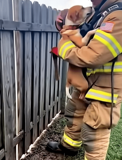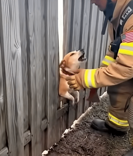 A firefighter in the area noticed the struggling dog and immediately moved closer to understand what was happening. Seeing the dog stuck in the wooden fence, he calmly approached so the frightened animal would not panic further.