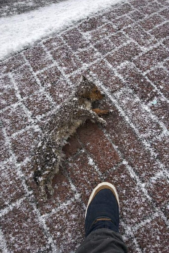 Lying motionless on the frozen ground was a tiny dog.