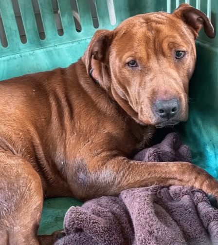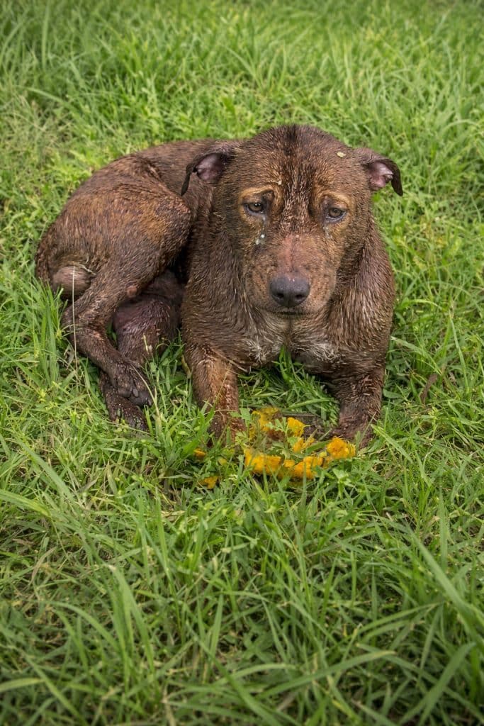 The dog looks exhausted, as if every ounce of strength has been drained from him. Standing seems almost impossible. Instead, he remains still, conserving what little energy he has left.