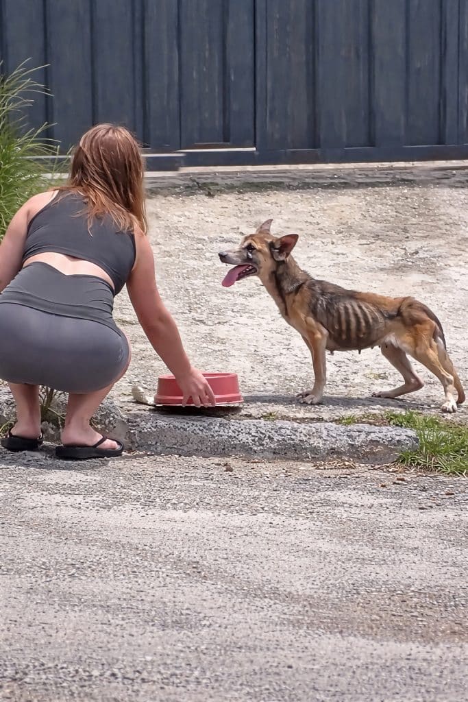 Careful not to startle the frightened animal, she placed a bowl of food gently on the ground and stepped back.