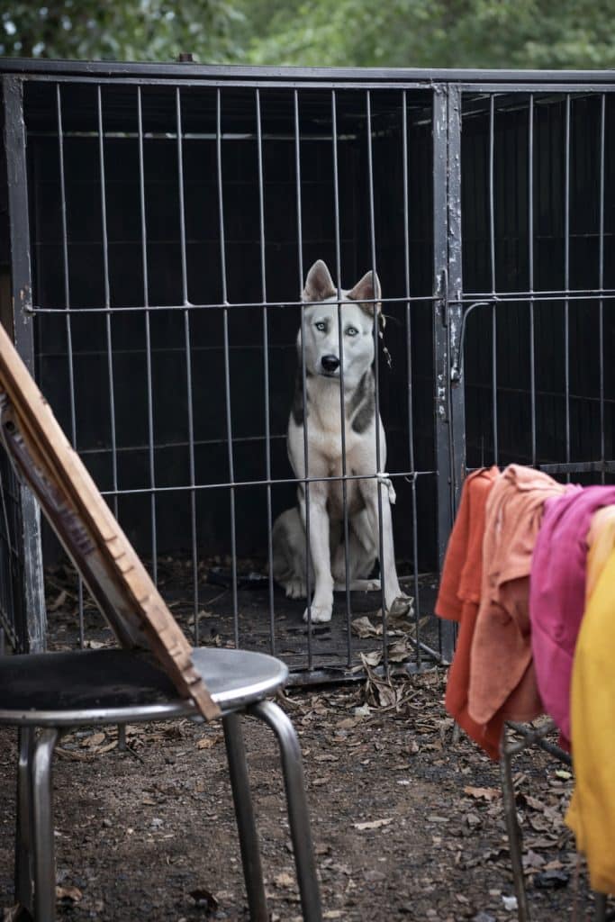The Husky–German Shepherd mix lived suspended above a narrow canal, the cage hanging over the water below. Rain fell through the bars. Cold wind passed through the metal. Day after day, season after season, nothing changed.
