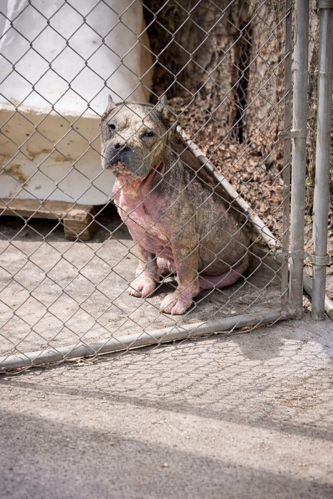 Vern was suffering from an extremely severe case of mange. His skin appeared cracked, inflamed, and irritated. Many areas were raw and fragile after years without proper treatment.