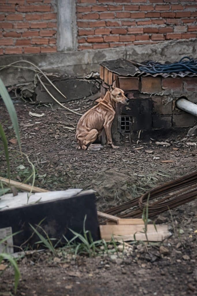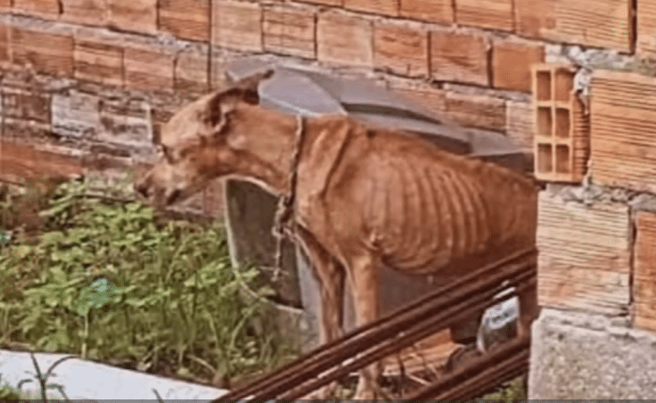 In a corner of a yard filled with debris and scattered waste, a thin dog stood chained with a heavy metal collar. Her body was painfully fragile—little more than skin and bones. Her fur was patchy, her skin irritated, and her small frame showed clear signs of long-term neglect.