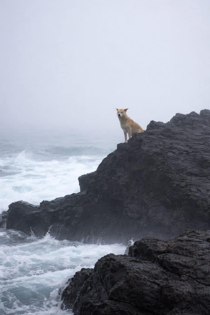 Along a rugged coastline, where dark volcanic rocks meet the crashing waves, a golden-colored dog could often be seen sitting alone.