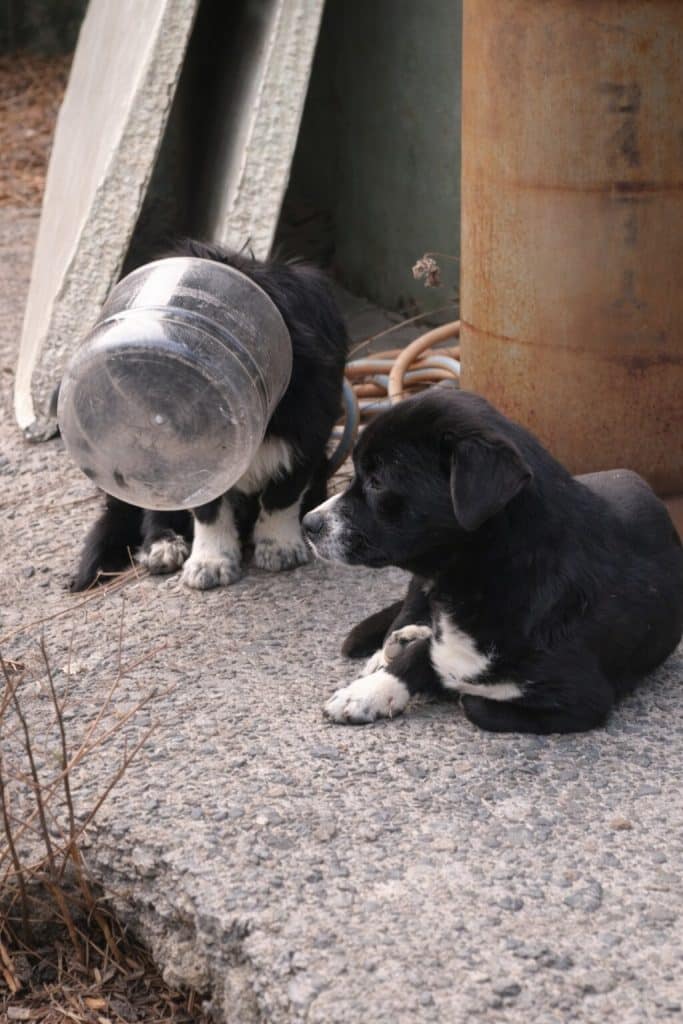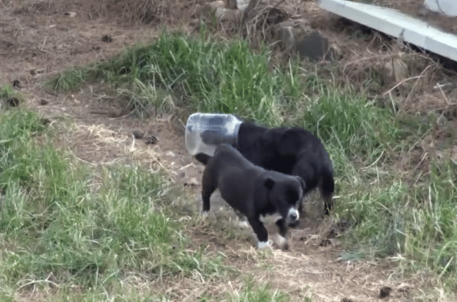 While searching through discarded waste for food, one of the dogs pushed his head into a large plastic jar… and couldn’t pull it back out.