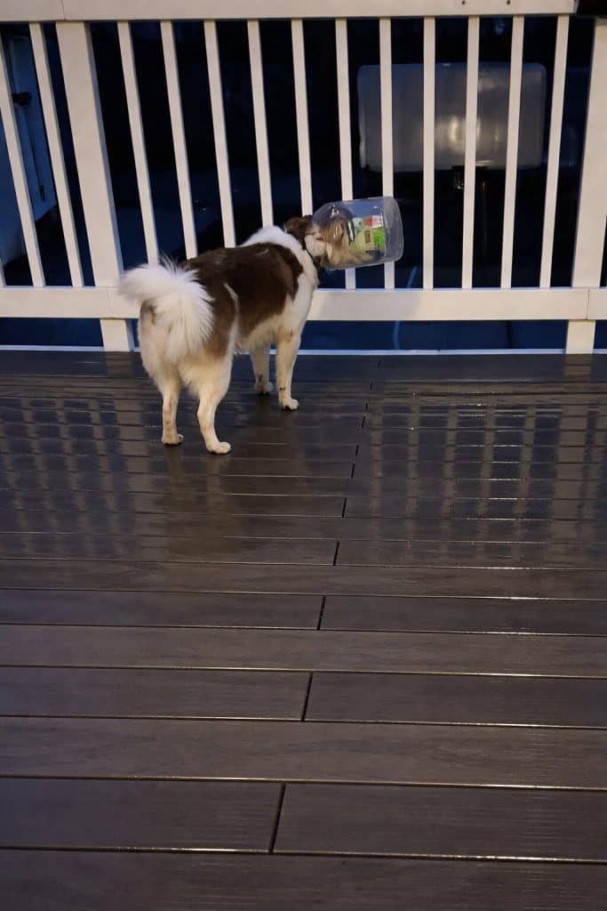 Somewhere nearby, he discovered a transparent plastic jar. Perhaps there had once been something tasty inside. Without hesitation, Dexter did what many dogs would do—he pushed his head inside to investigate.
