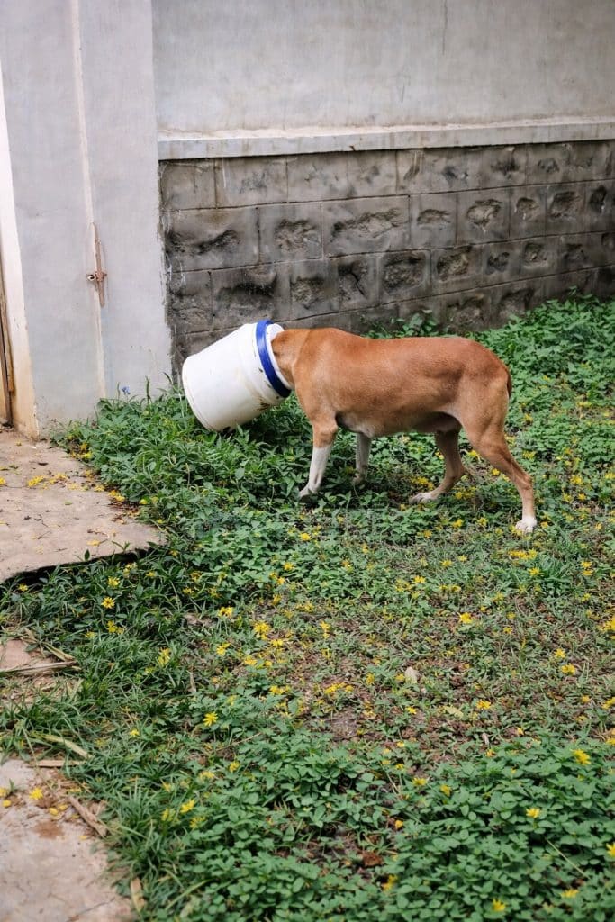 As people looked closer, they realized the dog’s head was completely trapped inside a white plastic bucket.