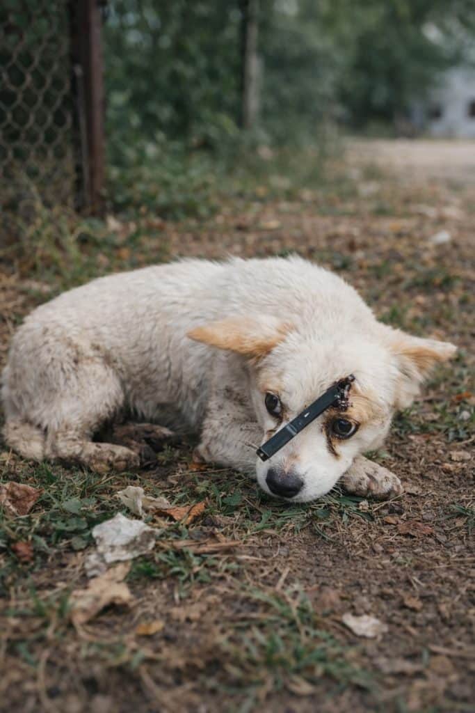 There was a sharp object embedded in the middle of the dog’s forehead.