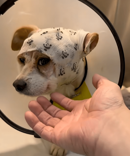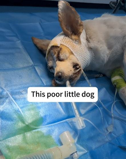 After the procedure, the little dog lay quietly, his head wrapped in bandages. He remained under close observation, supported by medical equipment as his body began to recover.