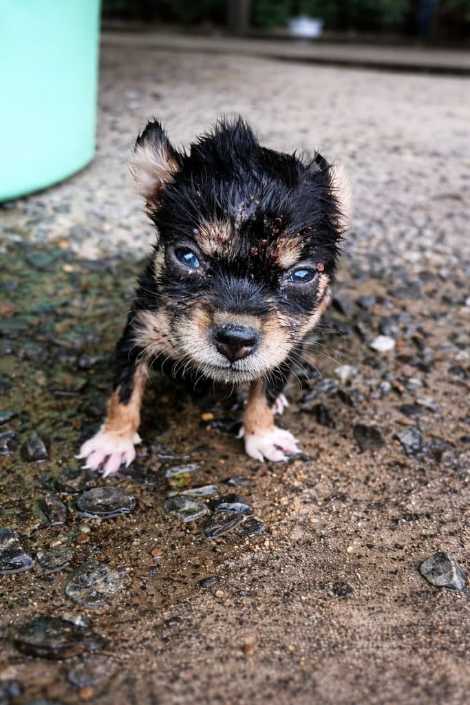 The video begins with a tiny black-and-tan puppy, soaked and trembling, trying to stay upright on unsteady legs. Her name would later be Mata.