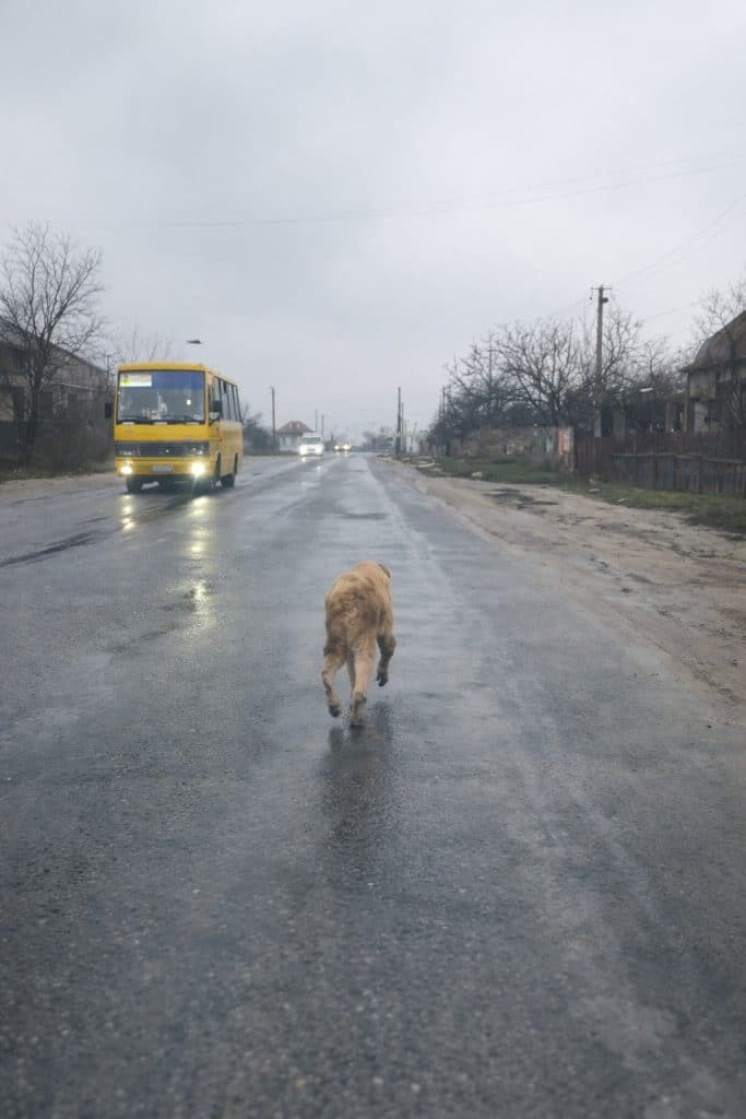 It was a cold, rainy afternoon when a driver noticed a large dog wandering along the wet asphalt road.