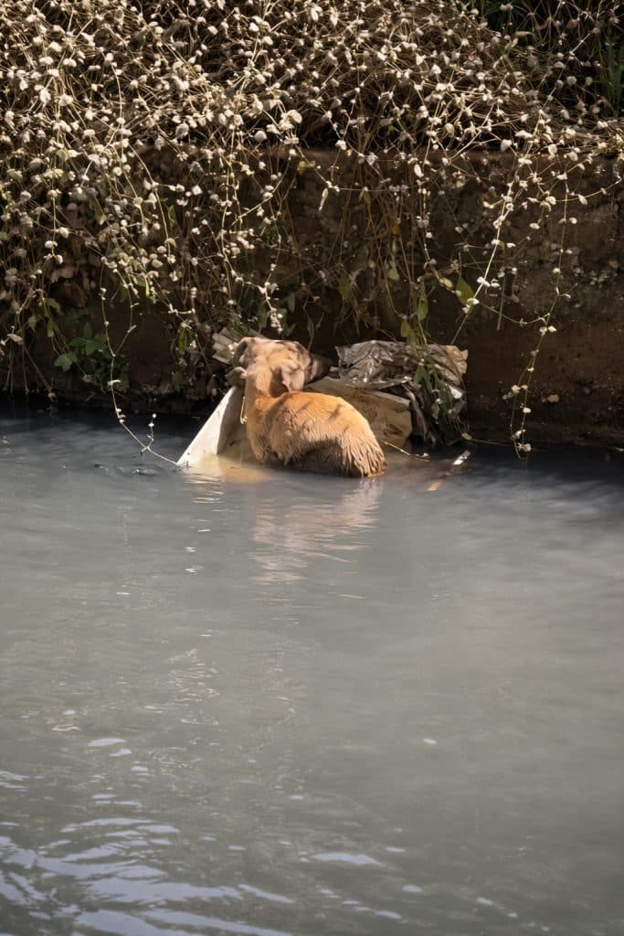 One of her little ones had slipped and fallen into a deep, dirty drainage ditch. The water below was murky and still, and the small puppy could not find a way out.