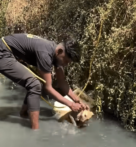 When the rescuers arrived, they assessed the situation carefully. The ditch was deep and filled with dirty water, making the rescue more challenging.
